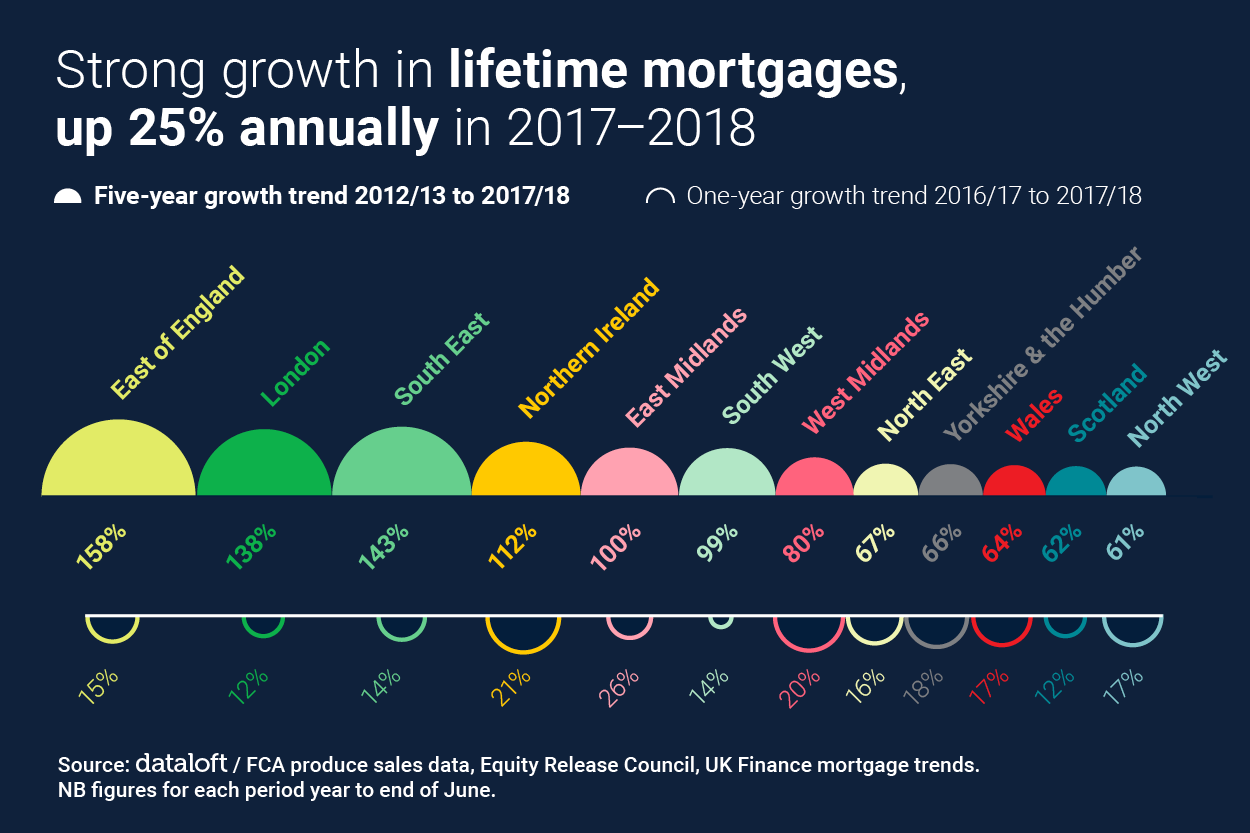 Older homeowners are increasingly accessing wealth from their properties through equity release. In 2018, 50p of housing wealth was unlocked for every £1 of flexible pension payment, highlighting the role of property wealth to finance later living. The lifetime mortgage market saw the biggest annual increase in new loans compared to other mortgage market sectors for the 3rd consecutive year. Between July 2018 and December 2018, 44,000 homeowners aged over 55 years, accessed money from the value of their property. Over the past five years, London and southern regions including the East of England, the South East and South West, experienced the strongest growth in consumer demand. More recently the East Midlands, West Midlands and Northern Ireland have seen the greatest increase in demand for lifetime mortgages, numbers rising by over 20% between 2016/17 and 2017/18.