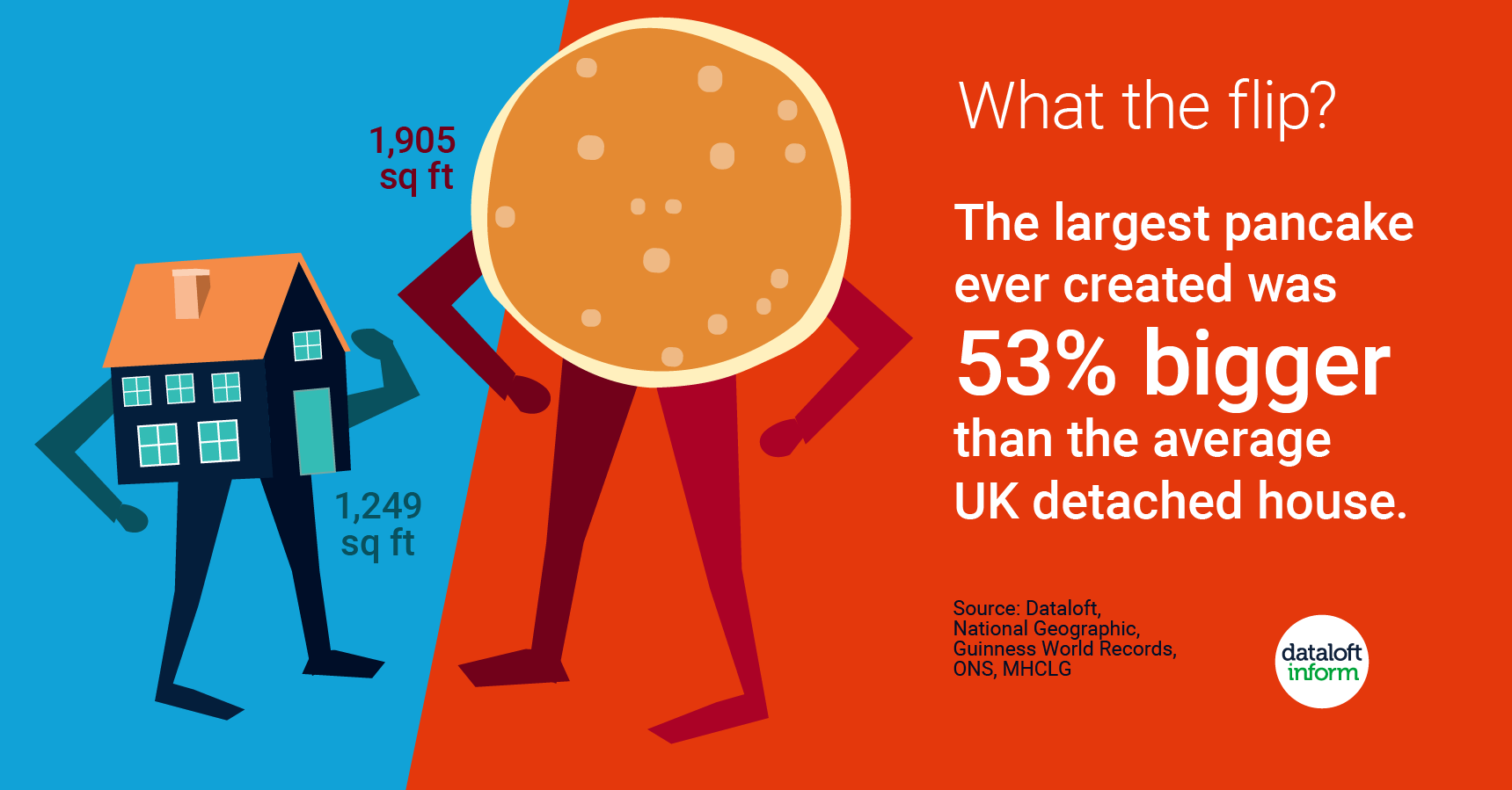 Pancakes have become such a popular Shrove Tuesday tradition that on 16th February, a whopping 52 million eggs will be used in the UK. That is 22 million more than your average day, eggciting stuff! With the average egg costing 19p, this equates to a total spend of £9.62 million on eggs. With the UK average house price of £249,633, this could almost buy you 39 houses. The largest pancake was created in Rochdale in 1994, by the Co-Operative Union, Ltd. The pancake had a surface area of 1,905 sq ft, 53% bigger than the internal size of an average UK detached house (1,249 sq ft).